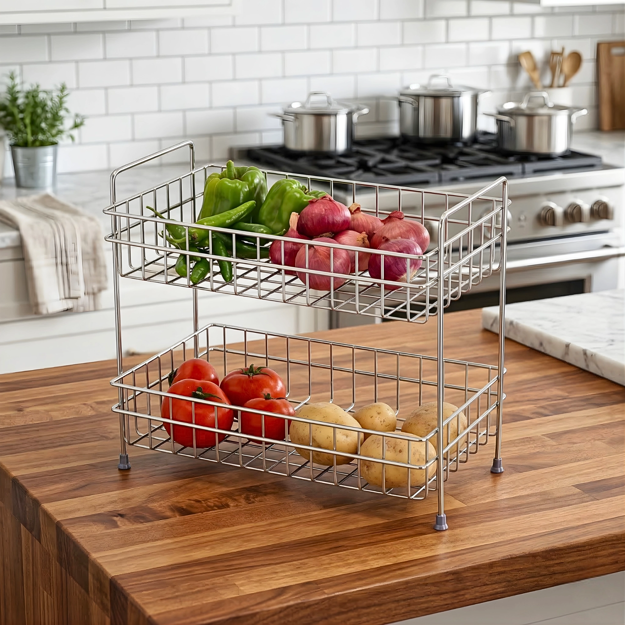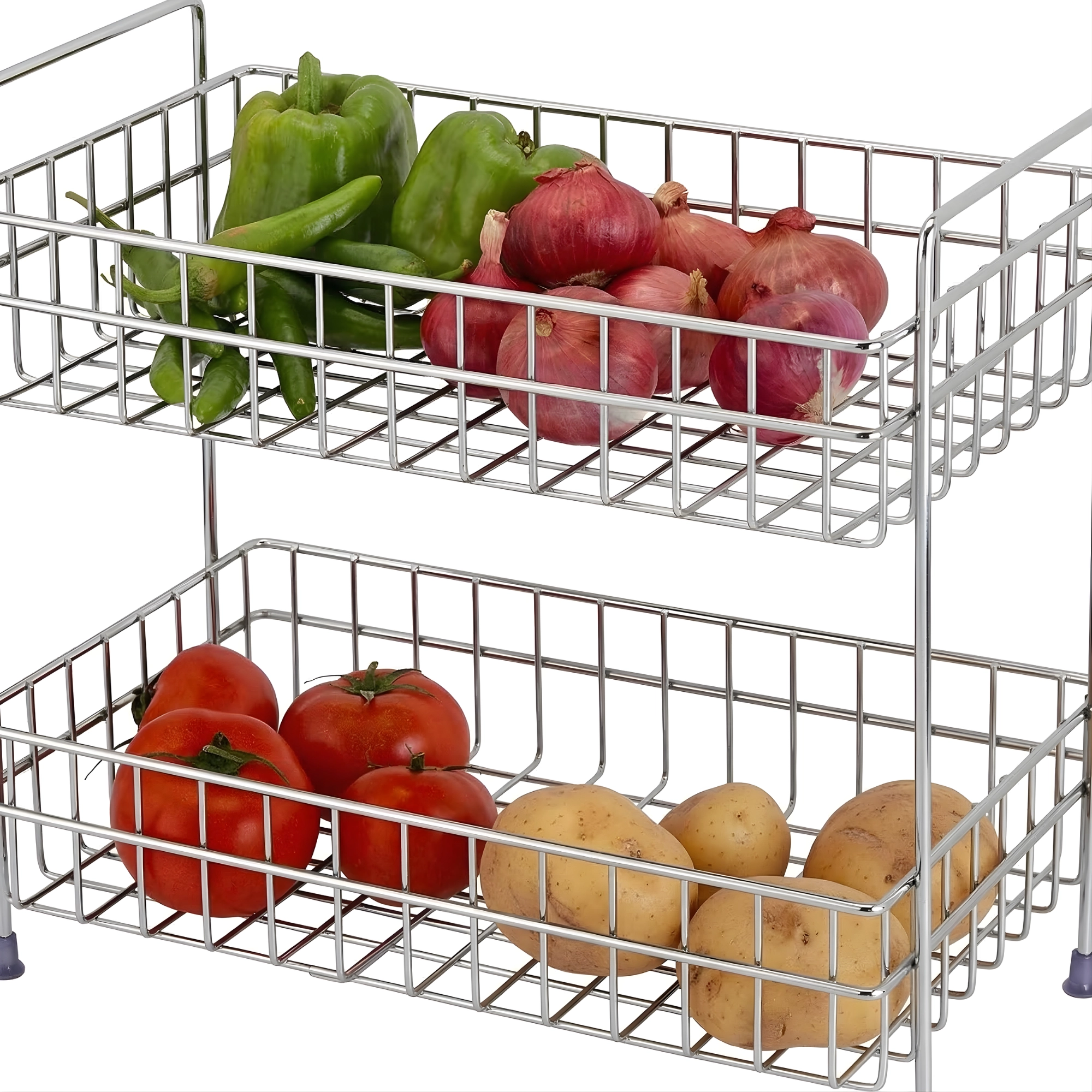 | Dual-Tier Design | Features two spacious wire baskets that provide double the storage capacity without increasing the footprint. |